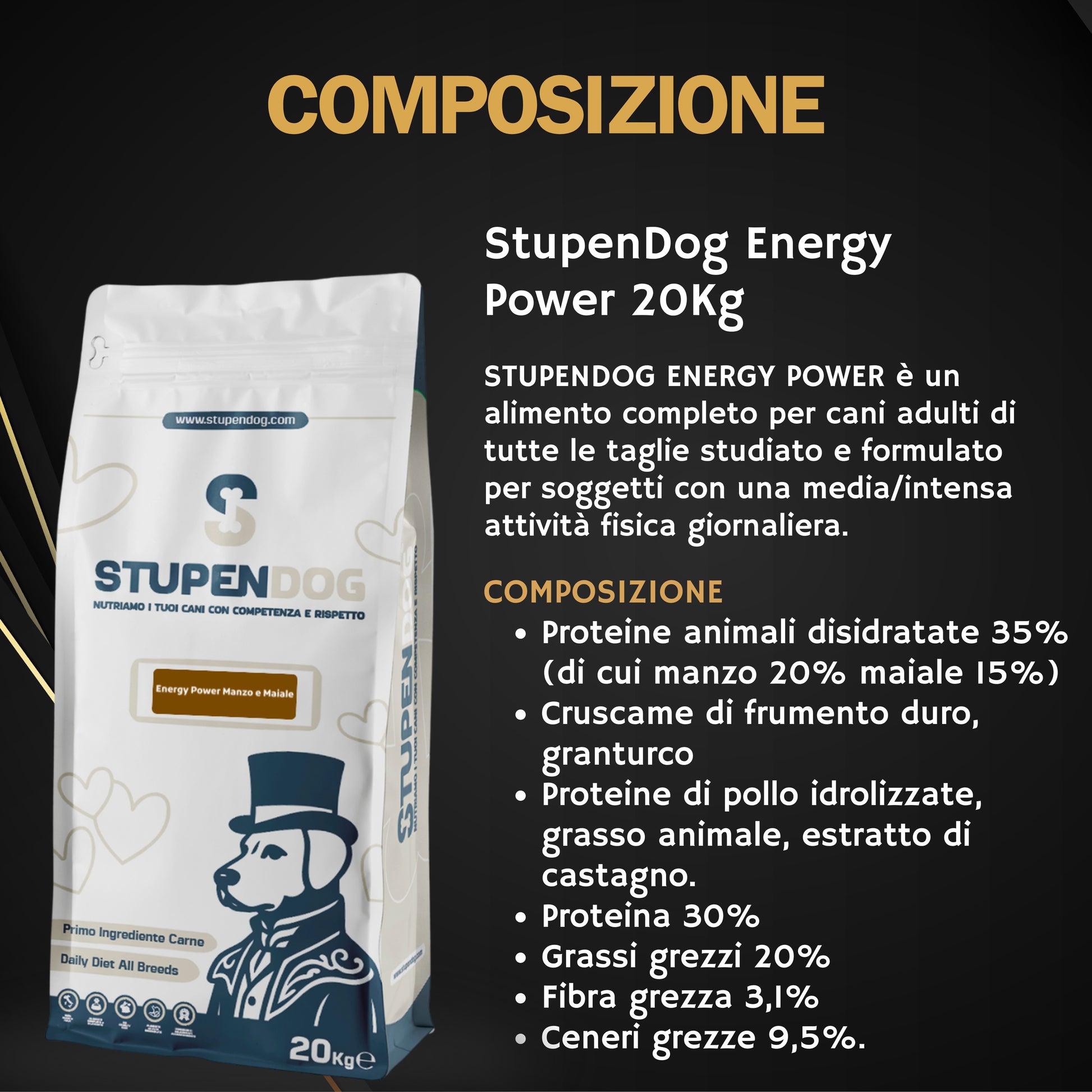 STUPENDOG ENERGY POWER è un alimento completo per cani adulti di tutte le taglie studiato e formulato per soggetti con una media/intensa attività fisica giornaliera. il gusto manzo e maiale garantisce un'appetibilità al nostro miglior amico senza aver alcun bisogno di utilizzare cibo umido. Inoltre queste crocchette sono studiate per cani da caccia oppure per chi ha bisogno di maggiore peso. Stupendog power power garantisce vantaggio anche per le articolazioni e muscolatura dei cani di grossa taglia come: cane corso, pastore tedesco, pitbull, pastore del caucaso.